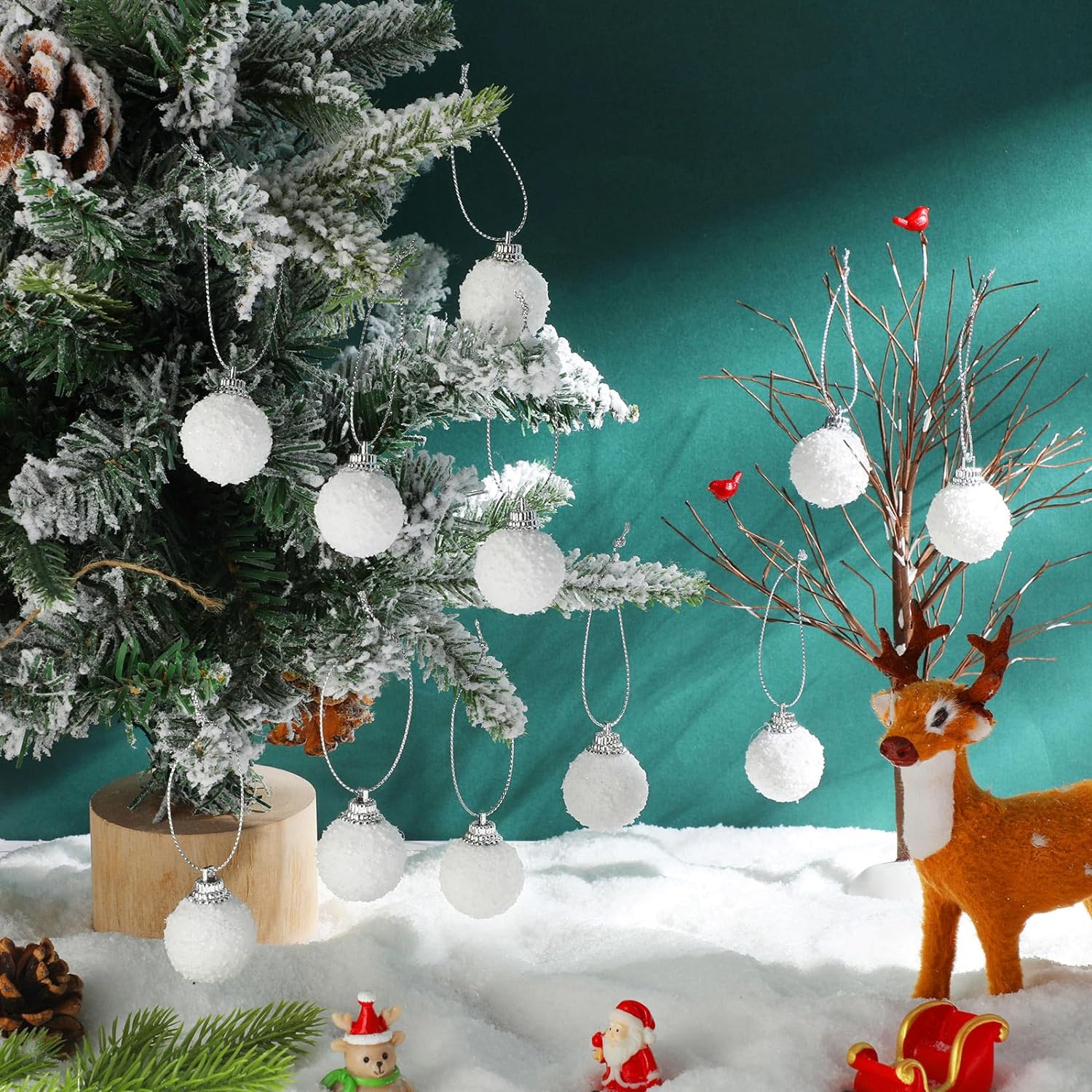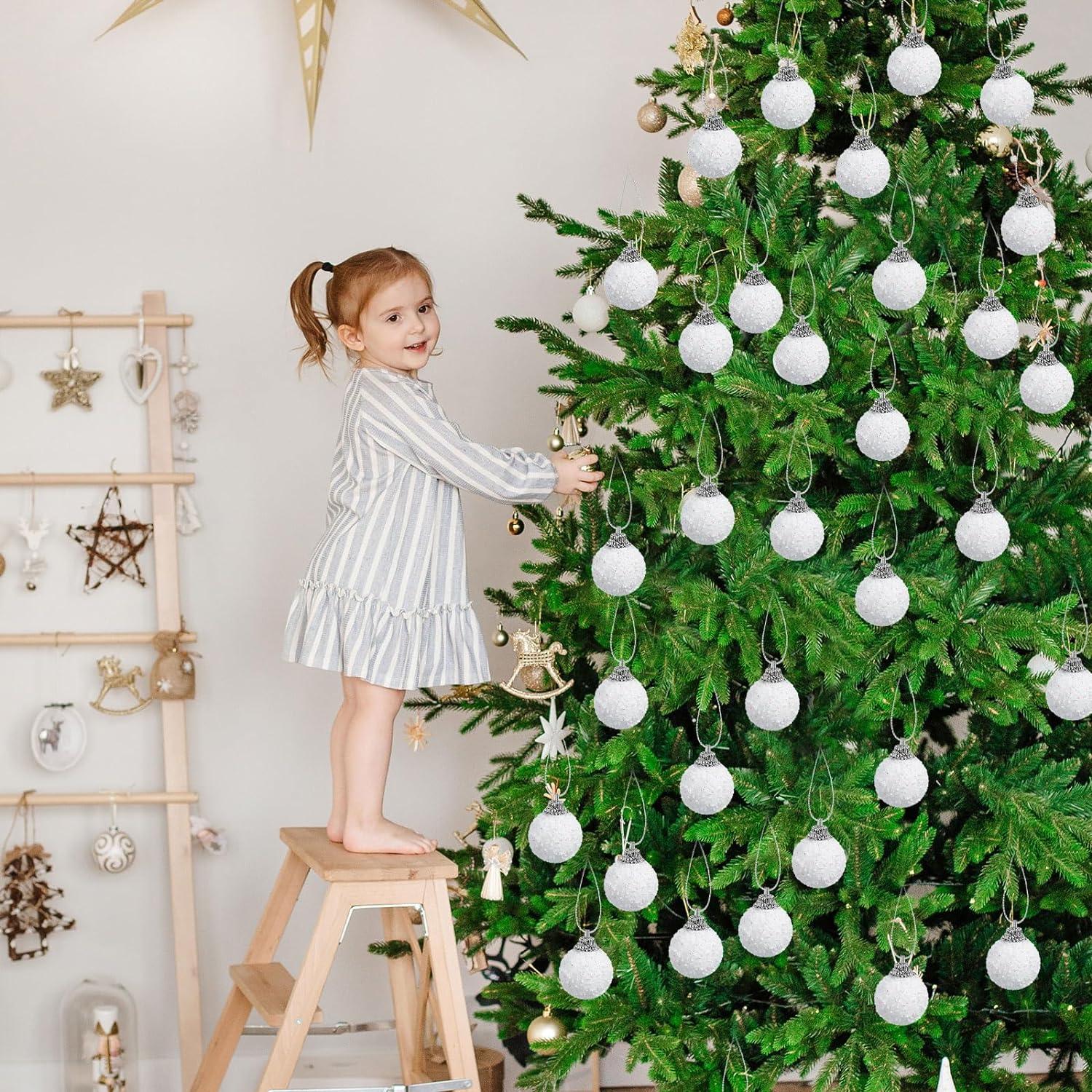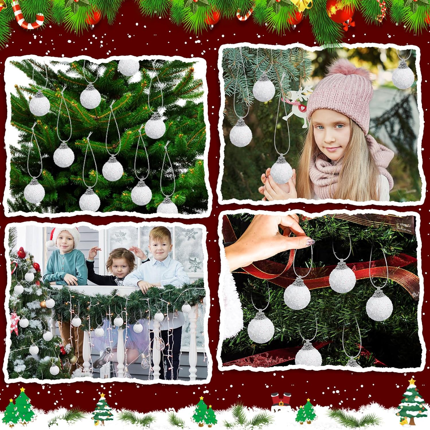 48 Pcs Mini Christmas Balls Ornaments Small Hanging White Snowballs Snowy Bauble Ornaments Xmas Tree Decoration (1.57 Inch)