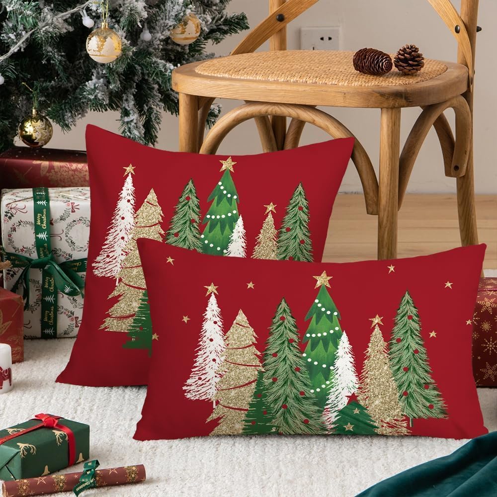 Christmas Pillow Cover 12X20 Colorful Christmas Tree Stars Decoration Holiday Farmhouse Winter Pillow Case Decor for Home Sofa Couch (Red) AA231-12 quantity