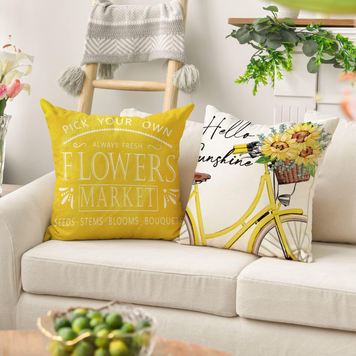 / Colorlife Hollo Love Sunflower Bicycle Yellow Throw Pillow Covers, 18 x 18 Inch Flowers Summer Spring Cushion Case for Sofa Couch Set of 4