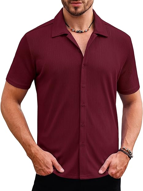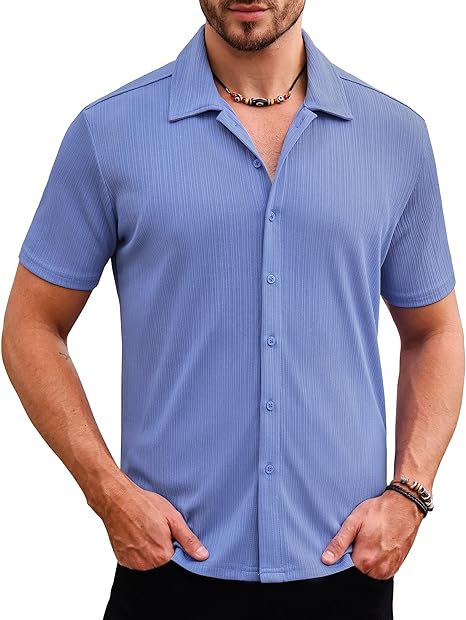 Versatile Styles: The men’s knit button-down shirt features vertical woven textures, showcasing elegance and style. It pairs effortlessly with beach shorts, long pants, or even shorts, offering a relaxed, sporty holiday look. Ideal for those seeking stylish and adaptable shirts.