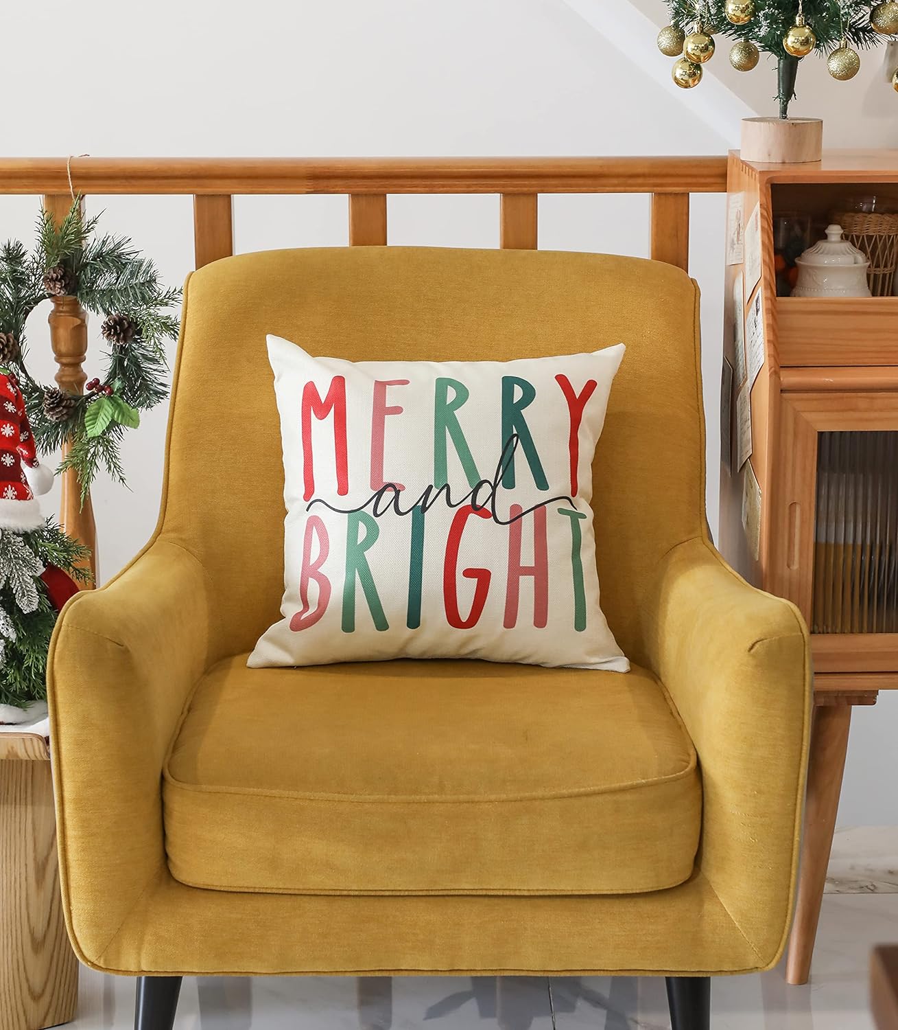 Merry Bright Christmas Pillow Covers Colorful Holiday Holly Jolly Set of 4 Winter Decorative Throw Pillow Covers Cushion Case for Home Sofa Bed Chair (18″ L x 18″ W)