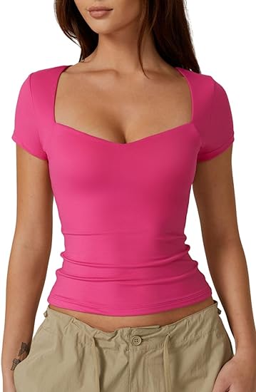 Slim Fit Basic Tee with Sweetheart Neckline and Short Sleeves, a Stylish Crop Top for Women